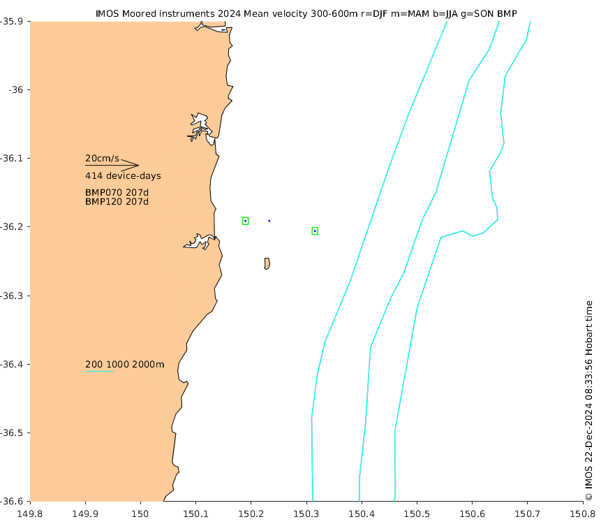 These maps show some basic analyses of the velocity data: mean (all-time in black and seasonal in colour) and sub-tidal variance for several layers and time-windows, and tidal harmonics for the depth-average velocity using the whole record. Click through to see more detailed plots of the selected dataset or to download those data from the AODN thredds server.