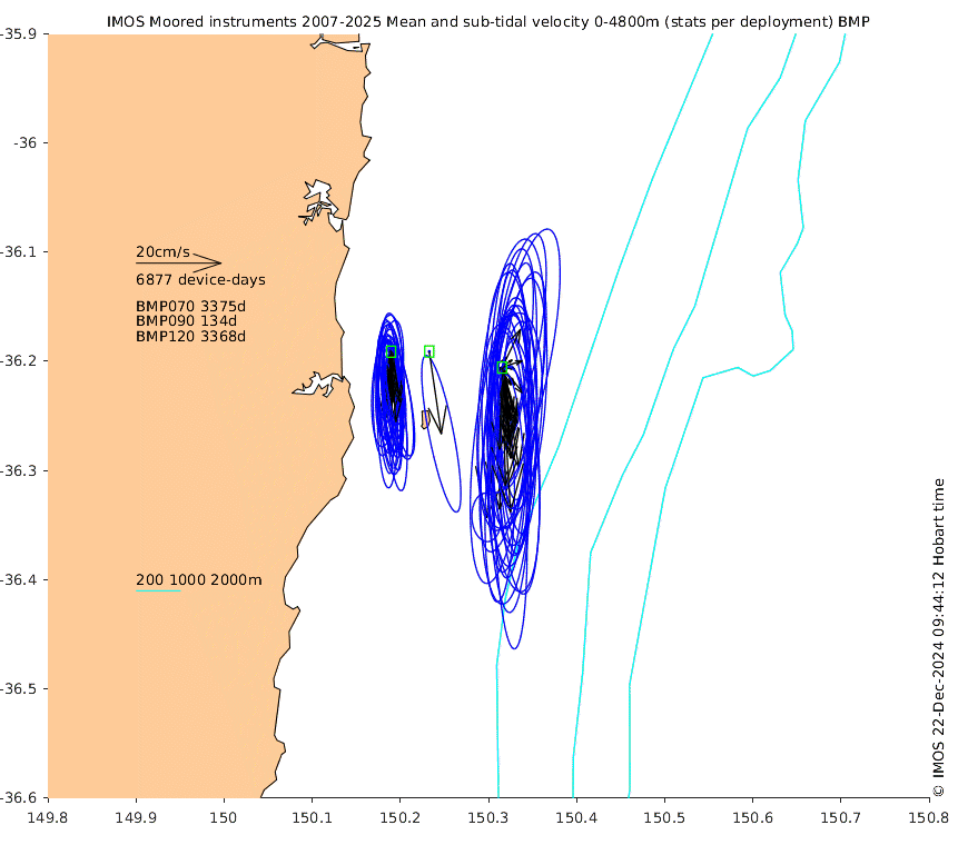 These maps show some basic analyses of the velocity data: mean (all-time in black and seasonal in colour) and sub-tidal variance for several layers and time-windows, and tidal harmonics for the depth-average velocity using the whole record. Click through to see more detailed plots of the selected dataset or to download those data from the AODN thredds server.