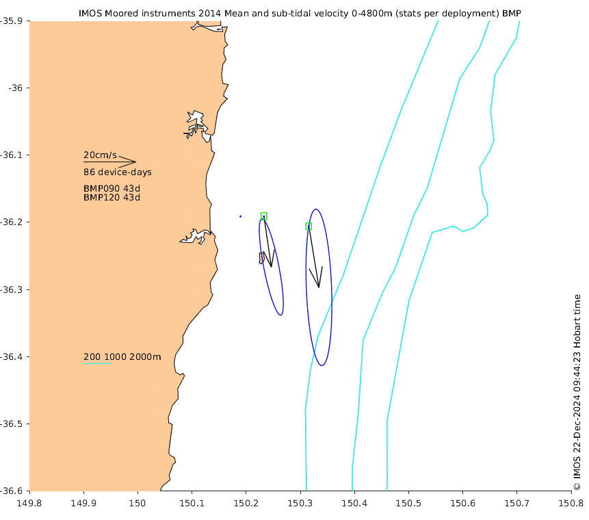 These maps show some basic analyses of the velocity data: mean (all-time in black and seasonal in colour) and sub-tidal variance for several layers and time-windows, and tidal harmonics for the depth-average velocity using the whole record. Click through to see more detailed plots of the selected dataset or to download those data from the AODN thredds server.