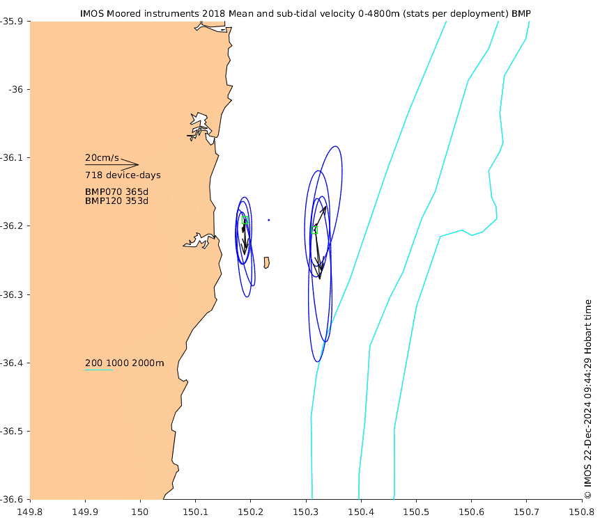These maps show some basic analyses of the velocity data: mean (all-time in black and seasonal in colour) and sub-tidal variance for several layers and time-windows, and tidal harmonics for the depth-average velocity using the whole record. Click through to see more detailed plots of the selected dataset or to download those data from the AODN thredds server.