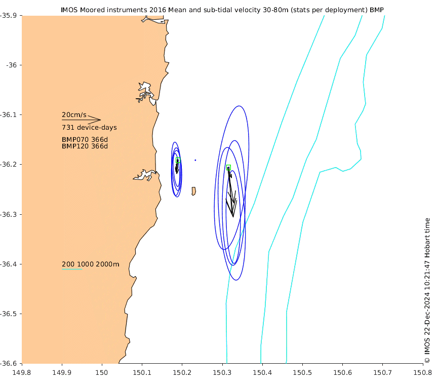 These maps show some basic analyses of the velocity data: mean (all-time in black and seasonal in colour) and sub-tidal variance for several layers and time-windows, and tidal harmonics for the depth-average velocity using the whole record. Click through to see more detailed plots of the selected dataset or to download those data from the AODN thredds server.
