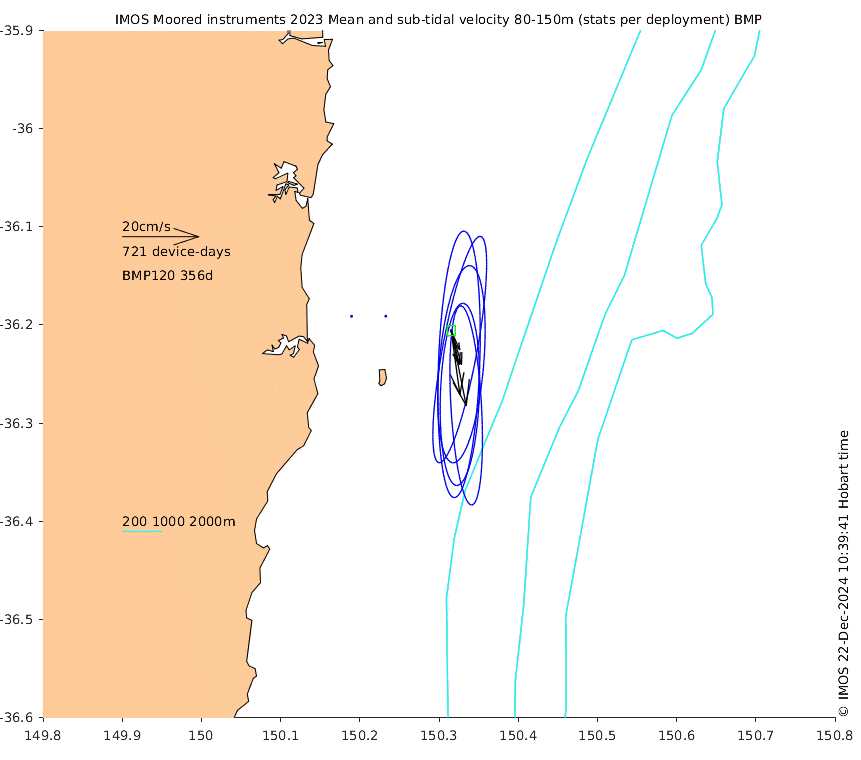 These maps show some basic analyses of the velocity data: mean (all-time in black and seasonal in colour) and sub-tidal variance for several layers and time-windows, and tidal harmonics for the depth-average velocity using the whole record. Click through to see more detailed plots of the selected dataset or to download those data from the AODN thredds server.