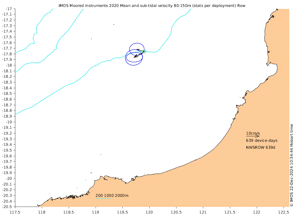 These maps show some basic analyses of the velocity data: mean (all-time in black and seasonal in colour) and sub-tidal variance for several layers and time-windows, and tidal harmonics for the depth-average velocity using the whole record. Click through to see more detailed plots of the selected dataset or to download those data from the AODN thredds server.