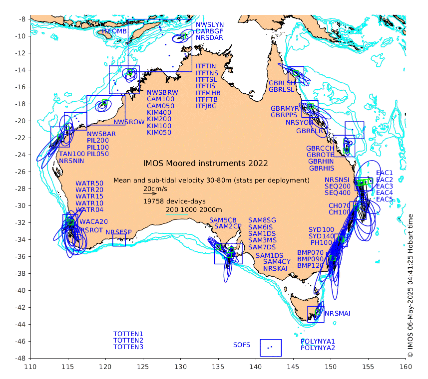 These maps show some basic analyses of the velocity data: mean (all-time in black and seasonal in colour) and sub-tidal variance for several layers and time-windows, and tidal harmonics for the depth-average velocity using the whole record. Click through to see more detailed plots of the selected dataset or to download those data from the AODN thredds server.