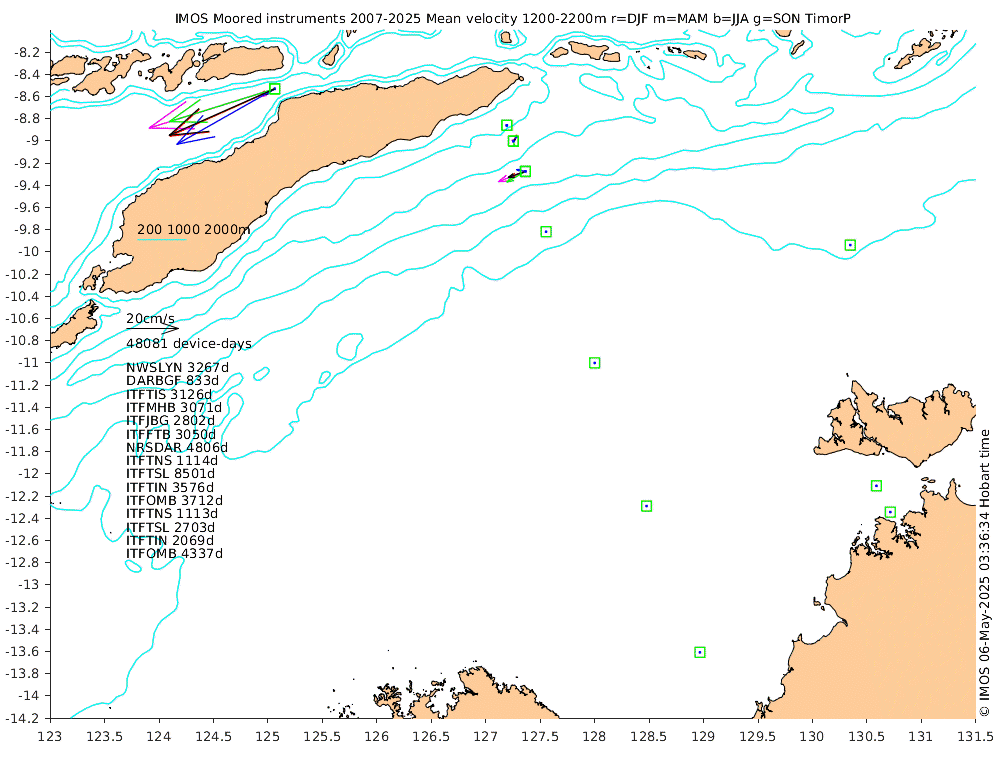 These maps show some basic analyses of the velocity data: mean (all-time in black and seasonal in colour) and sub-tidal variance for several layers and time-windows, and tidal harmonics for the depth-average velocity using the whole record. Click through to see more detailed plots of the selected dataset or to download those data from the AODN thredds server.