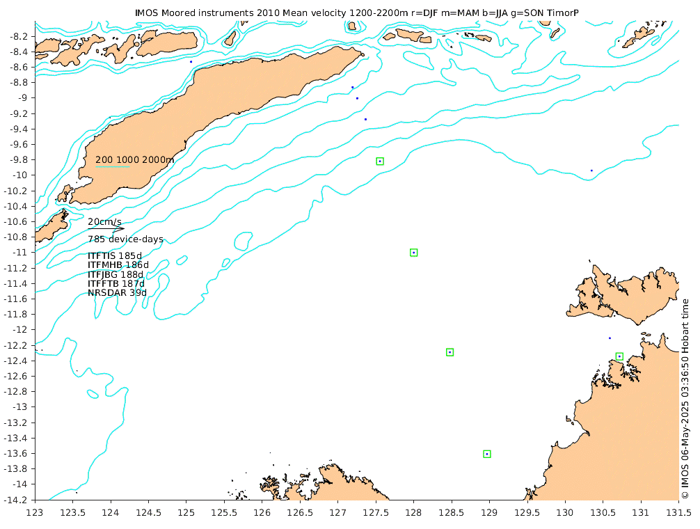 These maps show some basic analyses of the velocity data: mean (all-time in black and seasonal in colour) and sub-tidal variance for several layers and time-windows, and tidal harmonics for the depth-average velocity using the whole record. Click through to see more detailed plots of the selected dataset or to download those data from the AODN thredds server.