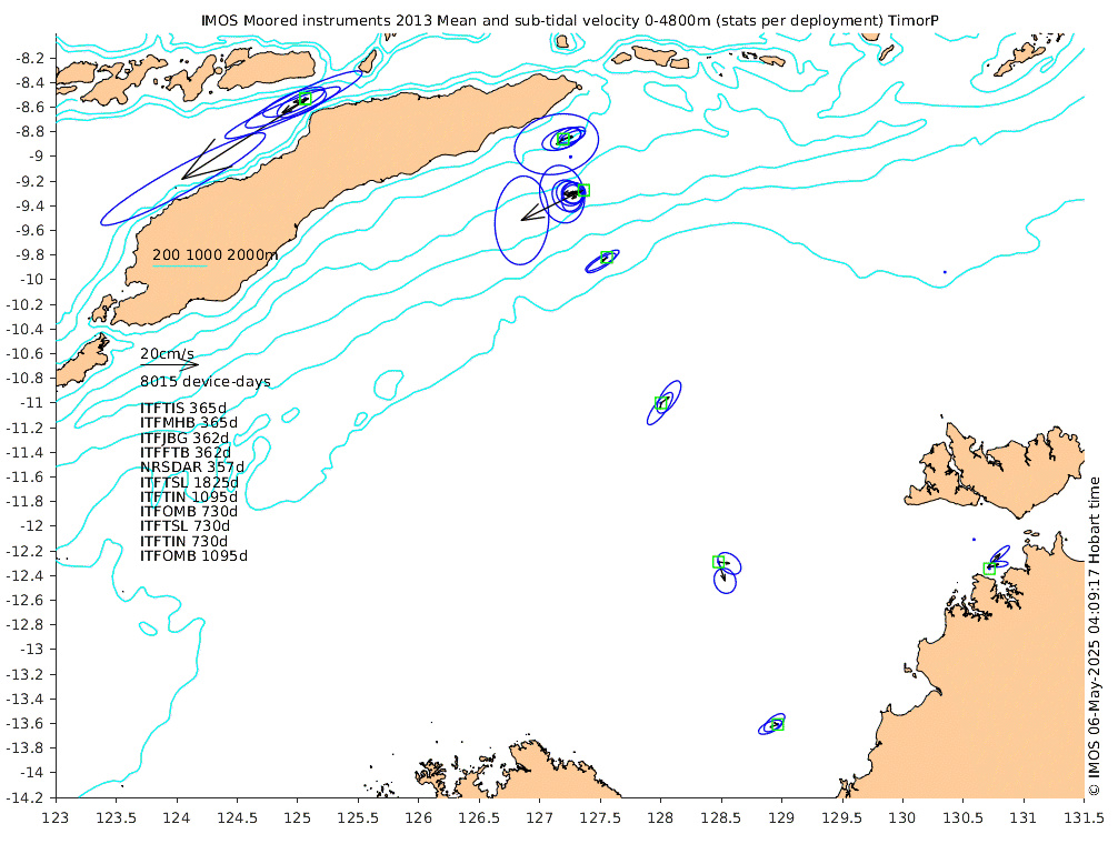 These maps show some basic analyses of the velocity data: mean (all-time in black and seasonal in colour) and sub-tidal variance for several layers and time-windows, and tidal harmonics for the depth-average velocity using the whole record. Click through to see more detailed plots of the selected dataset or to download those data from the AODN thredds server.