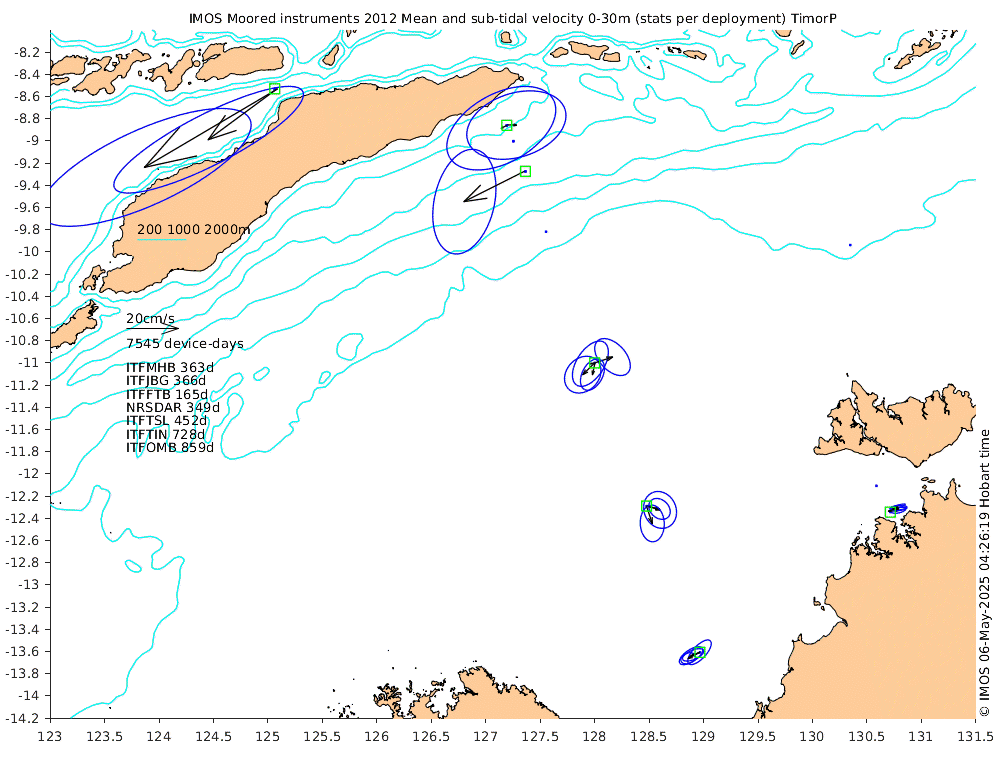 These maps show some basic analyses of the velocity data: mean (all-time in black and seasonal in colour) and sub-tidal variance for several layers and time-windows, and tidal harmonics for the depth-average velocity using the whole record. Click through to see more detailed plots of the selected dataset or to download those data from the AODN thredds server.