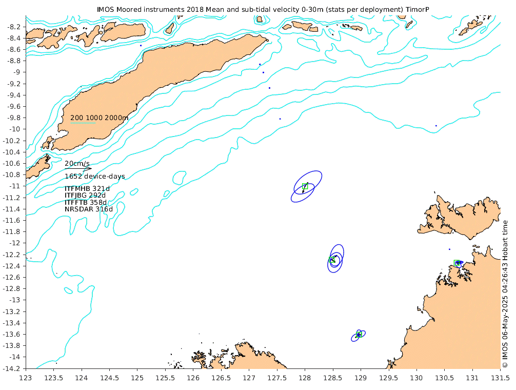 These maps show some basic analyses of the velocity data: mean (all-time in black and seasonal in colour) and sub-tidal variance for several layers and time-windows, and tidal harmonics for the depth-average velocity using the whole record. Click through to see more detailed plots of the selected dataset or to download those data from the AODN thredds server.