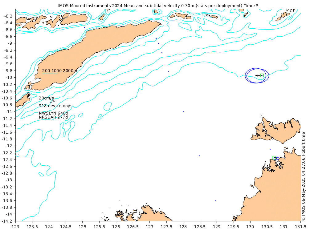 These maps show some basic analyses of the velocity data: mean (all-time in black and seasonal in colour) and sub-tidal variance for several layers and time-windows, and tidal harmonics for the depth-average velocity using the whole record. Click through to see more detailed plots of the selected dataset or to download those data from the AODN thredds server.