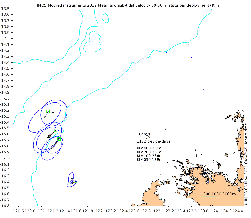 These maps show some basic analyses of the velocity data: mean (all-time in black and seasonal in colour) and sub-tidal variance for several layers and time-windows, and tidal harmonics for the depth-average velocity using the whole record. Click through to see more detailed plots of the selected dataset or to download those data from the AODN thredds server.