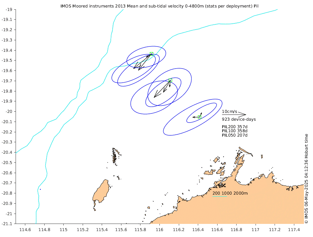 These maps show some basic analyses of the velocity data: mean (all-time in black and seasonal in colour) and sub-tidal variance for several layers and time-windows, and tidal harmonics for the depth-average velocity using the whole record. Click through to see more detailed plots of the selected dataset or to download those data from the AODN thredds server.