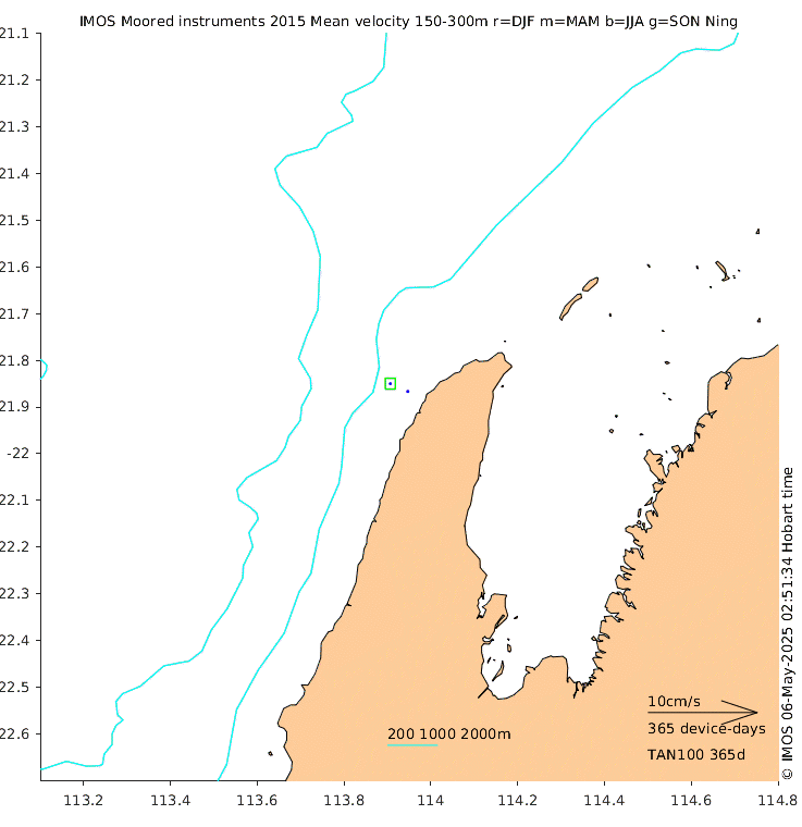 These maps show some basic analyses of the velocity data: mean (all-time in black and seasonal in colour) and sub-tidal variance for several layers and time-windows, and tidal harmonics for the depth-average velocity using the whole record. Click through to see more detailed plots of the selected dataset or to download those data from the AODN thredds server.