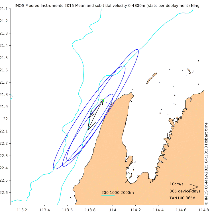 These maps show some basic analyses of the velocity data: mean (all-time in black and seasonal in colour) and sub-tidal variance for several layers and time-windows, and tidal harmonics for the depth-average velocity using the whole record. Click through to see more detailed plots of the selected dataset or to download those data from the AODN thredds server.