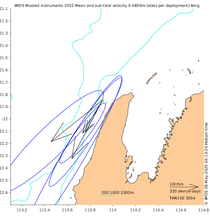 These maps show some basic analyses of the velocity data: mean (all-time in black and seasonal in colour) and sub-tidal variance for several layers and time-windows, and tidal harmonics for the depth-average velocity using the whole record. Click through to see more detailed plots of the selected dataset or to download those data from the AODN thredds server.