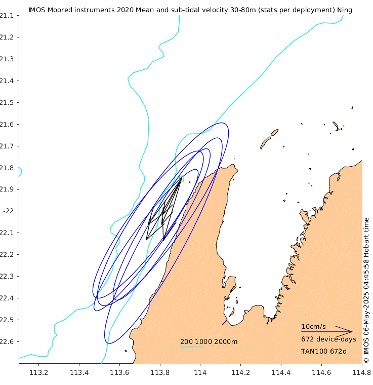 These maps show some basic analyses of the velocity data: mean (all-time in black and seasonal in colour) and sub-tidal variance for several layers and time-windows, and tidal harmonics for the depth-average velocity using the whole record. Click through to see more detailed plots of the selected dataset or to download those data from the AODN thredds server.