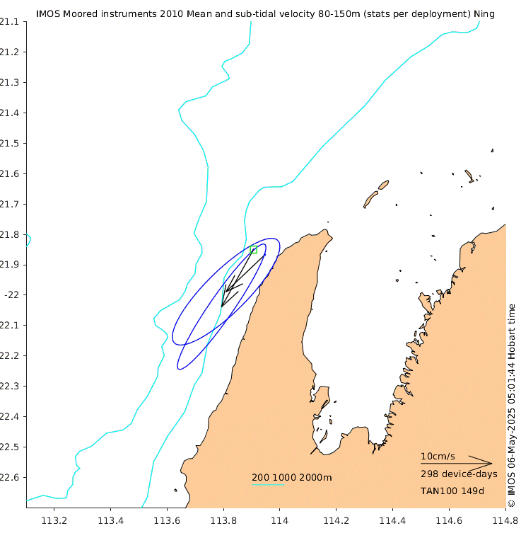 These maps show some basic analyses of the velocity data: mean (all-time in black and seasonal in colour) and sub-tidal variance for several layers and time-windows, and tidal harmonics for the depth-average velocity using the whole record. Click through to see more detailed plots of the selected dataset or to download those data from the AODN thredds server.