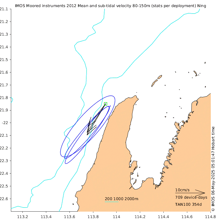 These maps show some basic analyses of the velocity data: mean (all-time in black and seasonal in colour) and sub-tidal variance for several layers and time-windows, and tidal harmonics for the depth-average velocity using the whole record. Click through to see more detailed plots of the selected dataset or to download those data from the AODN thredds server.