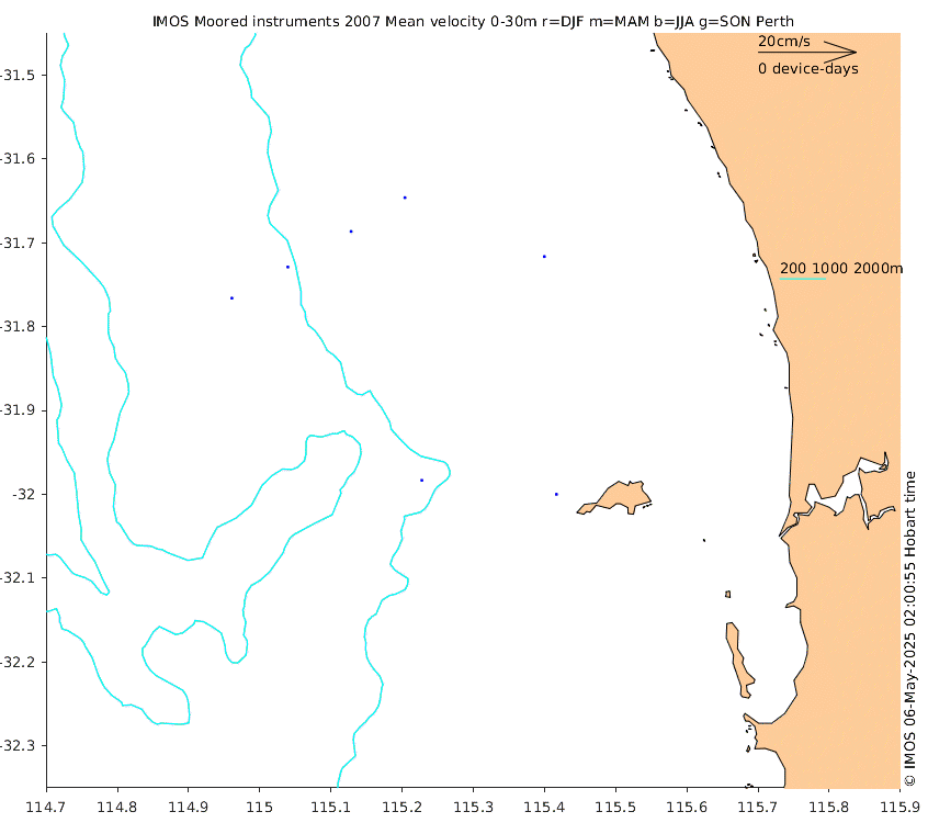 These maps show some basic analyses of the velocity data: mean (all-time in black and seasonal in colour) and sub-tidal variance for several layers and time-windows, and tidal harmonics for the depth-average velocity using the whole record. Click through to see more detailed plots of the selected dataset or to download those data from the AODN thredds server.