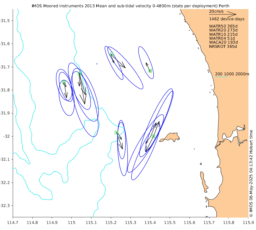 These maps show some basic analyses of the velocity data: mean (all-time in black and seasonal in colour) and sub-tidal variance for several layers and time-windows, and tidal harmonics for the depth-average velocity using the whole record. Click through to see more detailed plots of the selected dataset or to download those data from the AODN thredds server.