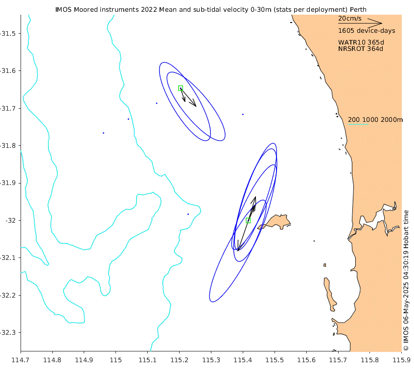 These maps show some basic analyses of the velocity data: mean (all-time in black and seasonal in colour) and sub-tidal variance for several layers and time-windows, and tidal harmonics for the depth-average velocity using the whole record. Click through to see more detailed plots of the selected dataset or to download those data from the AODN thredds server.