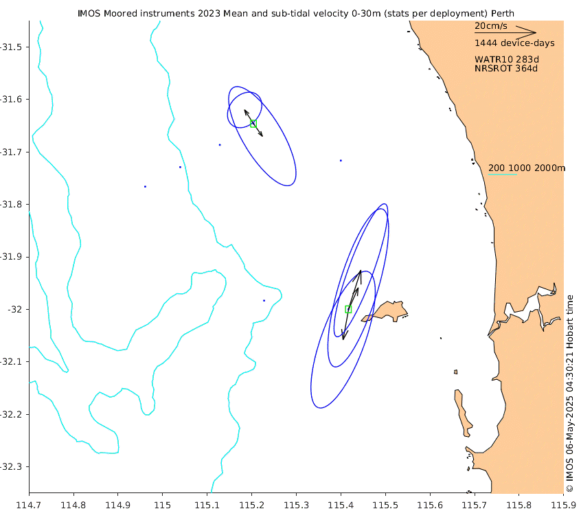 These maps show some basic analyses of the velocity data: mean (all-time in black and seasonal in colour) and sub-tidal variance for several layers and time-windows, and tidal harmonics for the depth-average velocity using the whole record. Click through to see more detailed plots of the selected dataset or to download those data from the AODN thredds server.