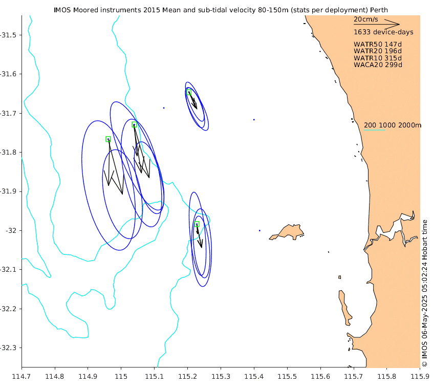 These maps show some basic analyses of the velocity data: mean (all-time in black and seasonal in colour) and sub-tidal variance for several layers and time-windows, and tidal harmonics for the depth-average velocity using the whole record. Click through to see more detailed plots of the selected dataset or to download those data from the AODN thredds server.
