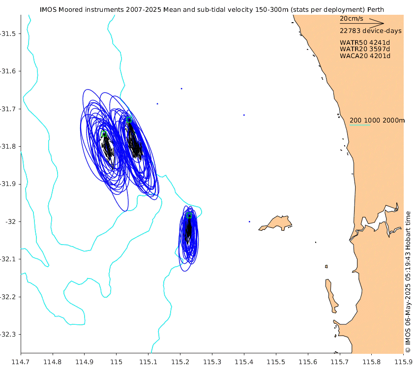 These maps show some basic analyses of the velocity data: mean (all-time in black and seasonal in colour) and sub-tidal variance for several layers and time-windows, and tidal harmonics for the depth-average velocity using the whole record. Click through to see more detailed plots of the selected dataset or to download those data from the AODN thredds server.