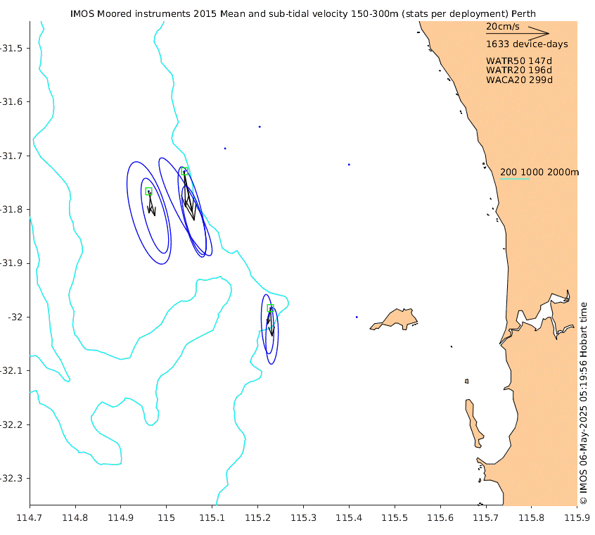 These maps show some basic analyses of the velocity data: mean (all-time in black and seasonal in colour) and sub-tidal variance for several layers and time-windows, and tidal harmonics for the depth-average velocity using the whole record. Click through to see more detailed plots of the selected dataset or to download those data from the AODN thredds server.