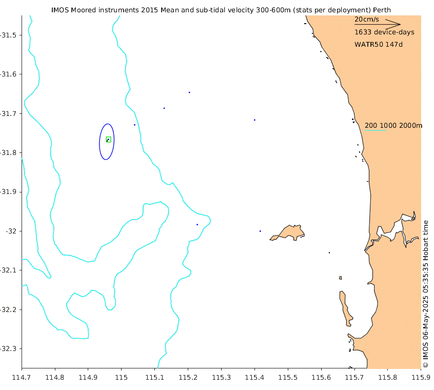 These maps show some basic analyses of the velocity data: mean (all-time in black and seasonal in colour) and sub-tidal variance for several layers and time-windows, and tidal harmonics for the depth-average velocity using the whole record. Click through to see more detailed plots of the selected dataset or to download those data from the AODN thredds server.