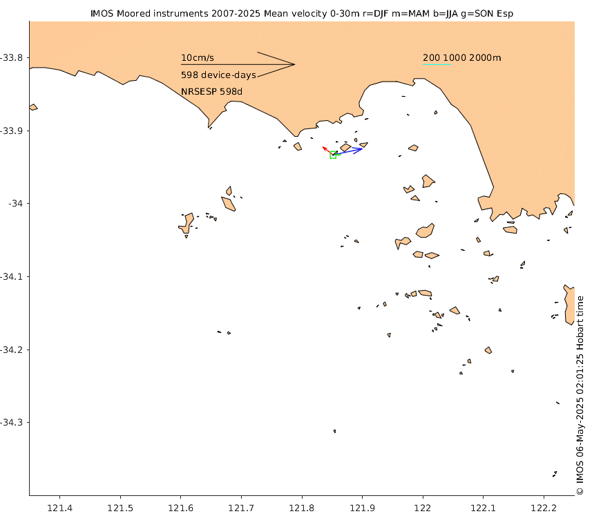 These maps show some basic analyses of the velocity data: mean (all-time in black and seasonal in colour) and sub-tidal variance for several layers and time-windows, and tidal harmonics for the depth-average velocity using the whole record. Click through to see more detailed plots of the selected dataset or to download those data from the AODN thredds server.