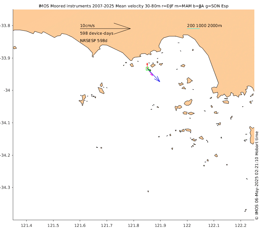 These maps show some basic analyses of the velocity data: mean (all-time in black and seasonal in colour) and sub-tidal variance for several layers and time-windows, and tidal harmonics for the depth-average velocity using the whole record. Click through to see more detailed plots of the selected dataset or to download those data from the AODN thredds server.