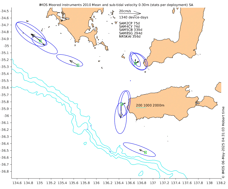 These maps show some basic analyses of the velocity data: mean (all-time in black and seasonal in colour) and sub-tidal variance for several layers and time-windows, and tidal harmonics for the depth-average velocity using the whole record. Click through to see more detailed plots of the selected dataset or to download those data from the AODN thredds server.