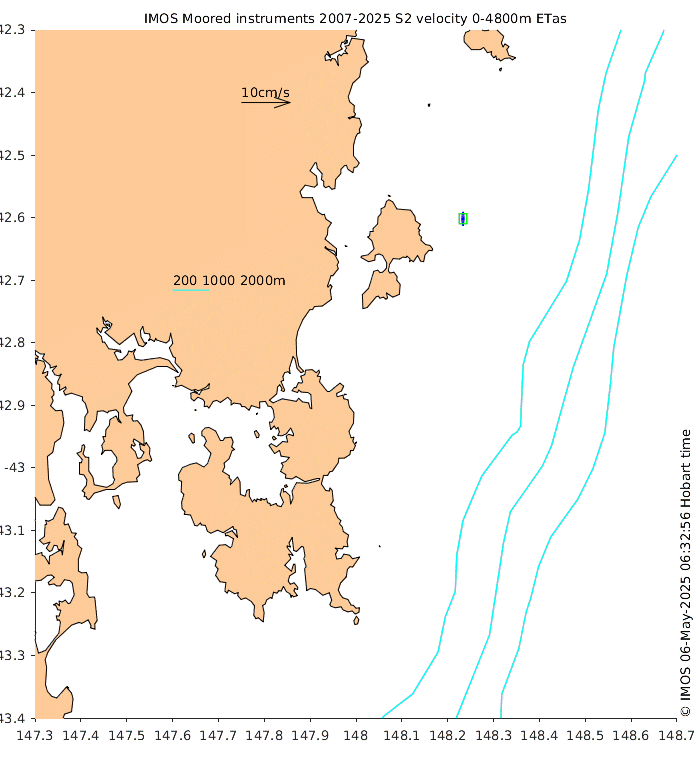 These maps show some basic analyses of the velocity data: mean (all-time in black and seasonal in colour) and sub-tidal variance for several layers and time-windows, and tidal harmonics for the depth-average velocity using the whole record. Click through to see more detailed plots of the selected dataset or to download those data from the AODN thredds server.