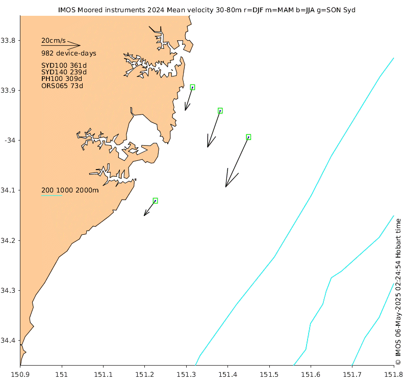 These maps show some basic analyses of the velocity data: mean (all-time in black and seasonal in colour) and sub-tidal variance for several layers and time-windows, and tidal harmonics for the depth-average velocity using the whole record. Click through to see more detailed plots of the selected dataset or to download those data from the AODN thredds server.