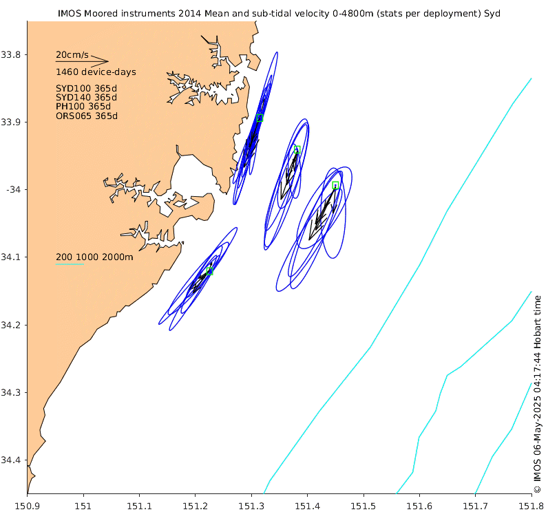 These maps show some basic analyses of the velocity data: mean (all-time in black and seasonal in colour) and sub-tidal variance for several layers and time-windows, and tidal harmonics for the depth-average velocity using the whole record. Click through to see more detailed plots of the selected dataset or to download those data from the AODN thredds server.