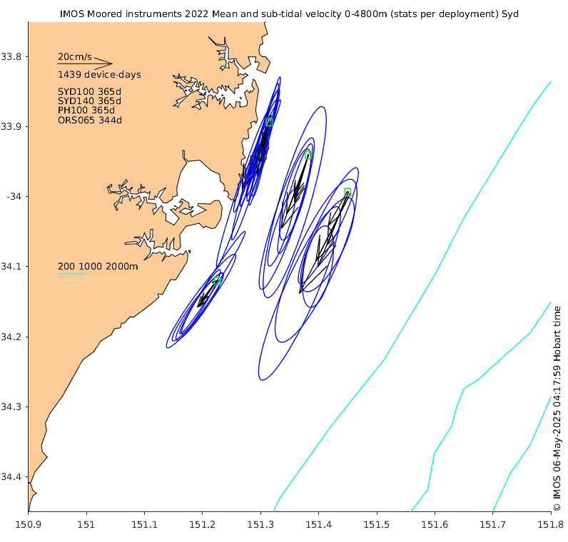 These maps show some basic analyses of the velocity data: mean (all-time in black and seasonal in colour) and sub-tidal variance for several layers and time-windows, and tidal harmonics for the depth-average velocity using the whole record. Click through to see more detailed plots of the selected dataset or to download those data from the AODN thredds server.