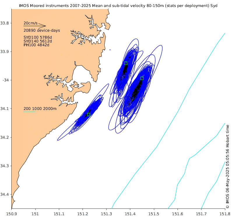 These maps show some basic analyses of the velocity data: mean (all-time in black and seasonal in colour) and sub-tidal variance for several layers and time-windows, and tidal harmonics for the depth-average velocity using the whole record. Click through to see more detailed plots of the selected dataset or to download those data from the AODN thredds server.
