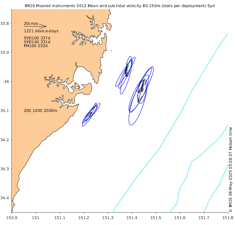 These maps show some basic analyses of the velocity data: mean (all-time in black and seasonal in colour) and sub-tidal variance for several layers and time-windows, and tidal harmonics for the depth-average velocity using the whole record. Click through to see more detailed plots of the selected dataset or to download those data from the AODN thredds server.