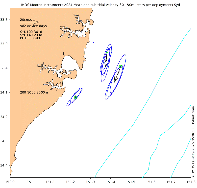 These maps show some basic analyses of the velocity data: mean (all-time in black and seasonal in colour) and sub-tidal variance for several layers and time-windows, and tidal harmonics for the depth-average velocity using the whole record. Click through to see more detailed plots of the selected dataset or to download those data from the AODN thredds server.