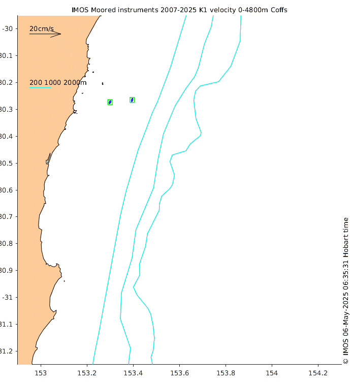 These maps show some basic analyses of the velocity data: mean (all-time in black and seasonal in colour) and sub-tidal variance for several layers and time-windows, and tidal harmonics for the depth-average velocity using the whole record. Click through to see more detailed plots of the selected dataset or to download those data from the AODN thredds server.