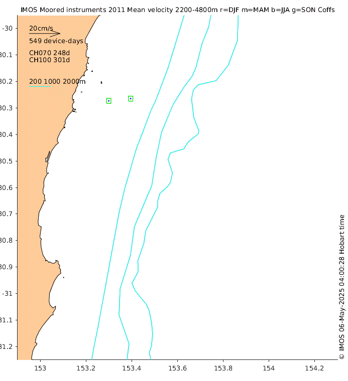 These maps show some basic analyses of the velocity data: mean (all-time in black and seasonal in colour) and sub-tidal variance for several layers and time-windows, and tidal harmonics for the depth-average velocity using the whole record. Click through to see more detailed plots of the selected dataset or to download those data from the AODN thredds server.
