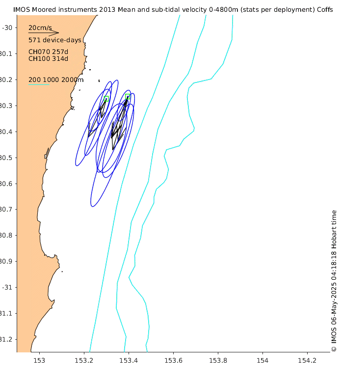 These maps show some basic analyses of the velocity data: mean (all-time in black and seasonal in colour) and sub-tidal variance for several layers and time-windows, and tidal harmonics for the depth-average velocity using the whole record. Click through to see more detailed plots of the selected dataset or to download those data from the AODN thredds server.