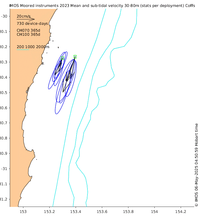 These maps show some basic analyses of the velocity data: mean (all-time in black and seasonal in colour) and sub-tidal variance for several layers and time-windows, and tidal harmonics for the depth-average velocity using the whole record. Click through to see more detailed plots of the selected dataset or to download those data from the AODN thredds server.
