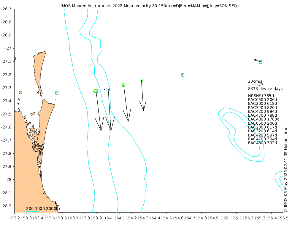 These maps show some basic analyses of the velocity data: mean (all-time in black and seasonal in colour) and sub-tidal variance for several layers and time-windows, and tidal harmonics for the depth-average velocity using the whole record. Click through to see more detailed plots of the selected dataset or to download those data from the AODN thredds server.