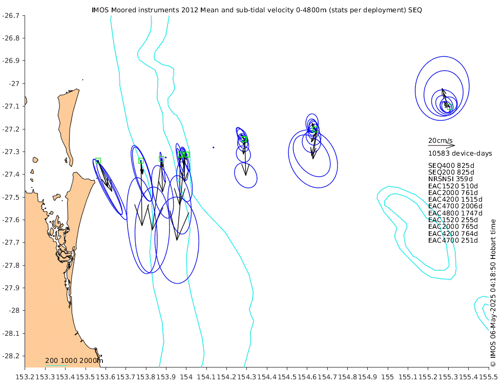 These maps show some basic analyses of the velocity data: mean (all-time in black and seasonal in colour) and sub-tidal variance for several layers and time-windows, and tidal harmonics for the depth-average velocity using the whole record. Click through to see more detailed plots of the selected dataset or to download those data from the AODN thredds server.
