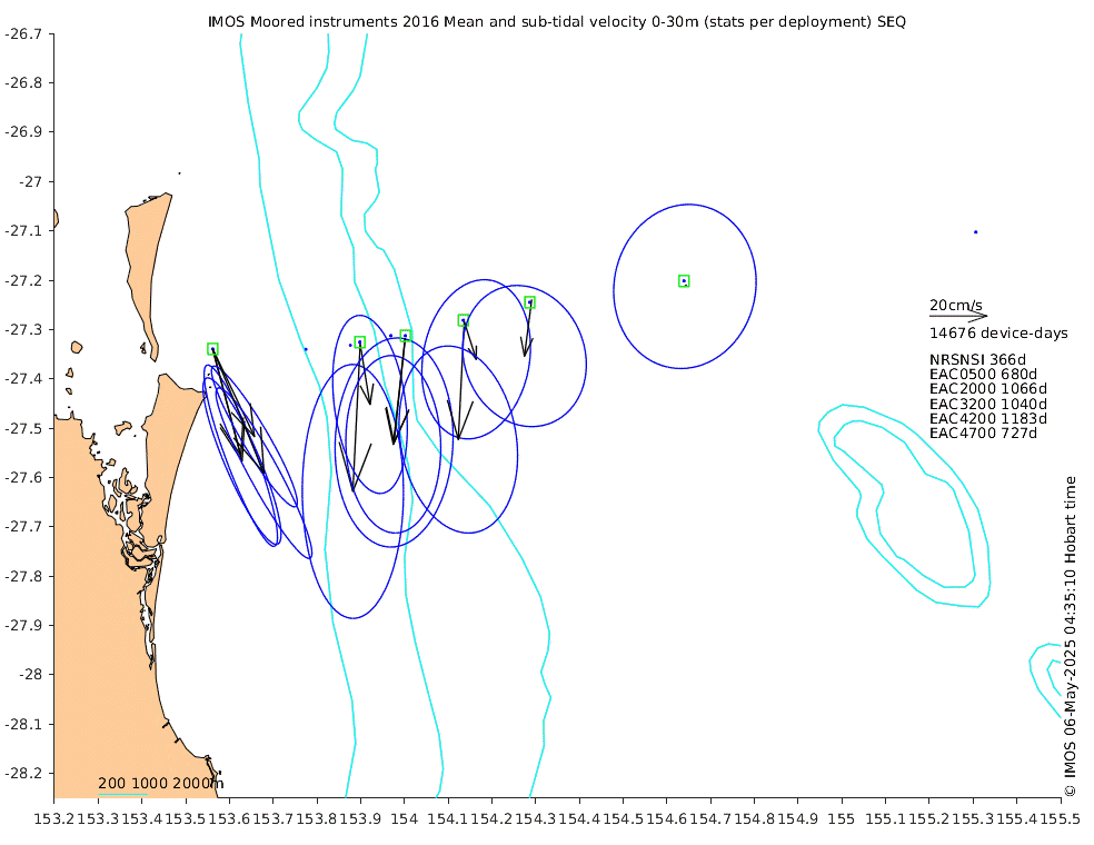 These maps show some basic analyses of the velocity data: mean (all-time in black and seasonal in colour) and sub-tidal variance for several layers and time-windows, and tidal harmonics for the depth-average velocity using the whole record. Click through to see more detailed plots of the selected dataset or to download those data from the AODN thredds server.