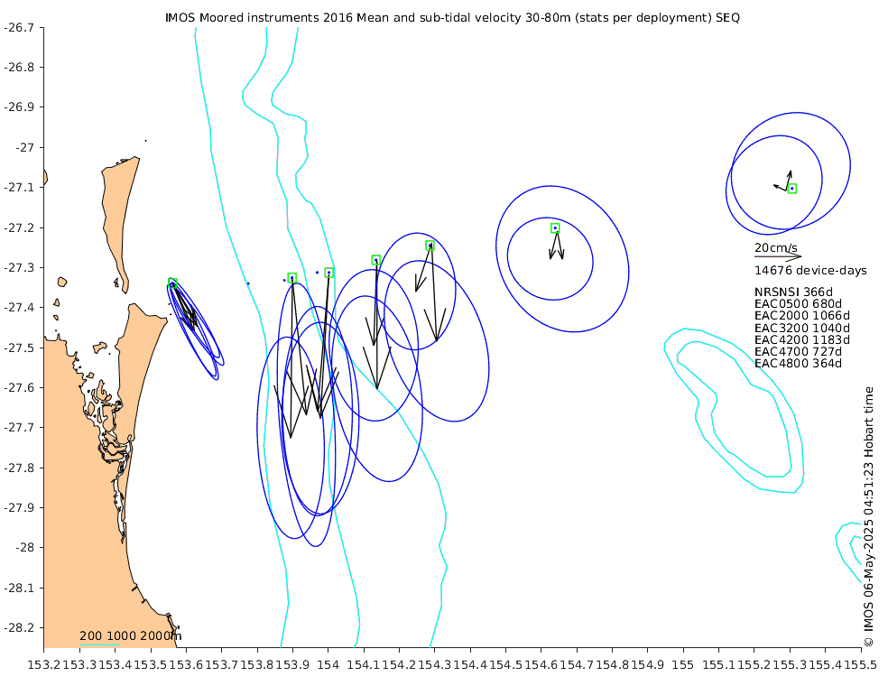 These maps show some basic analyses of the velocity data: mean (all-time in black and seasonal in colour) and sub-tidal variance for several layers and time-windows, and tidal harmonics for the depth-average velocity using the whole record. Click through to see more detailed plots of the selected dataset or to download those data from the AODN thredds server.