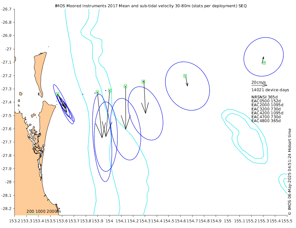 These maps show some basic analyses of the velocity data: mean (all-time in black and seasonal in colour) and sub-tidal variance for several layers and time-windows, and tidal harmonics for the depth-average velocity using the whole record. Click through to see more detailed plots of the selected dataset or to download those data from the AODN thredds server.