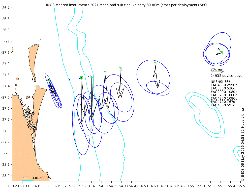 These maps show some basic analyses of the velocity data: mean (all-time in black and seasonal in colour) and sub-tidal variance for several layers and time-windows, and tidal harmonics for the depth-average velocity using the whole record. Click through to see more detailed plots of the selected dataset or to download those data from the AODN thredds server.